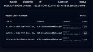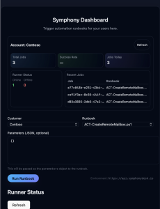 The Symphony Dashboard (portal.symphonydesk.io) provides a simple, fast, and secure interface for triggering automation runbooks, viewing job history, and monitoring connected runners. It is designed for IT teams who want an easy way to execute backend automations without using scripts or APIs directly.